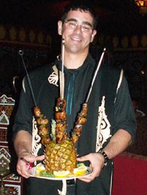 To begin with, you will enjoy tender, perfectly cooked Shrimp Scampi sautéed in lemon wine and garlic sauce. OH, how fantastic. You just scoop it up with a piece of their homemade Moroccan Bread. YUM! Then you move onto the Sarira Soup with lentil, rice, lemon and spices. I am not even a soup lover and I sipped down the whole bowl. Remember, no spoons! The next course, Marrakech Salad with hummus and vegetables, I completely devoured. Next came the Shish Kabob, which is made up of Filet Mignon marinated and grilled to perfection, served flaming on spears impaled on a pineapple. I made a complete pig of myself right there in front of everyone. Thank goodness, the gorgeous belly dancer came out at this point of the meal, which took all eyes away from me making a complete foodie out of myself!